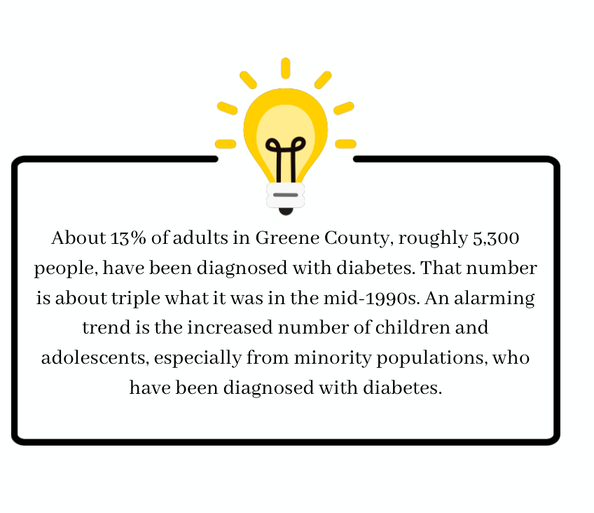 a warning sign that it’s time to take action. It often has no symptoms, so many people don’t know they have it. Nearly 20% of people who have diabetes have not been diagnosed (as many as 9,520 people in Greene County) because their symptoms may be overlooked or misunderstood; therefore, they are not receiving the recommended medical care that has been proven to prevent diabetes complications.